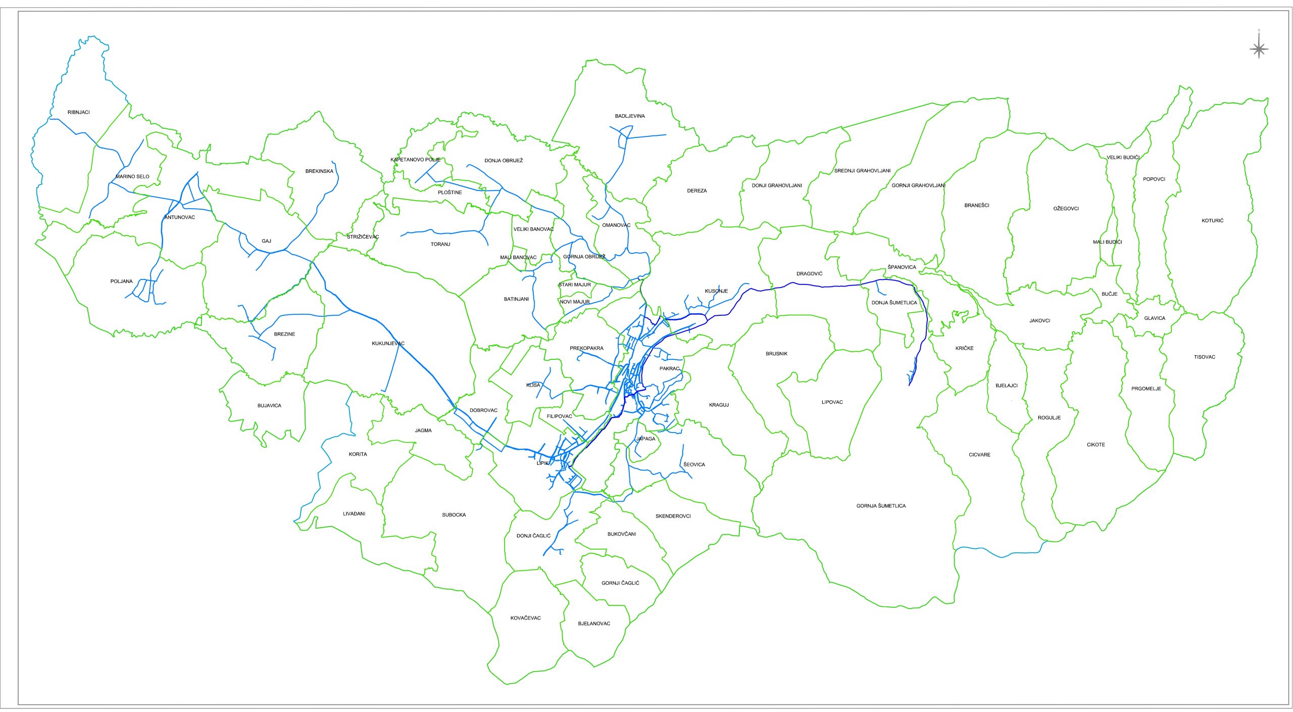 - Grad Pakrac: Batinjani, Donja Obrijež, Donja Šumetlica, Gornja Obrijež, Gornja Šumetlica, Kapetanovo Polje, Kusonje, Mali Banovac, Novi Majur, Omanovac, Pakrac, Ploštine, Prekopakra, Stari Majur, Toranj i Veliki Banovac